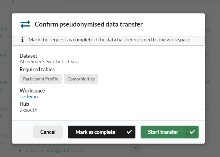 Where the data transfer is not initated directly from FAIR, the transfer can be marked as complete using the Mark as Complete button.
