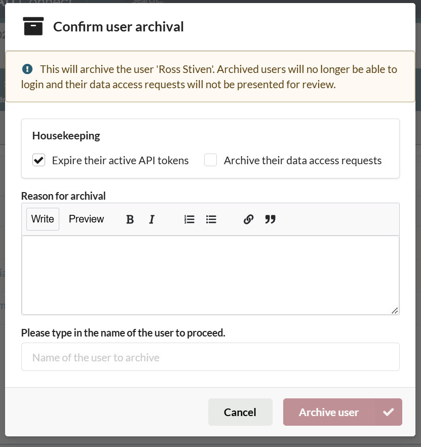 - If selected, the user's API tokens will be expired and any DARs will be archived