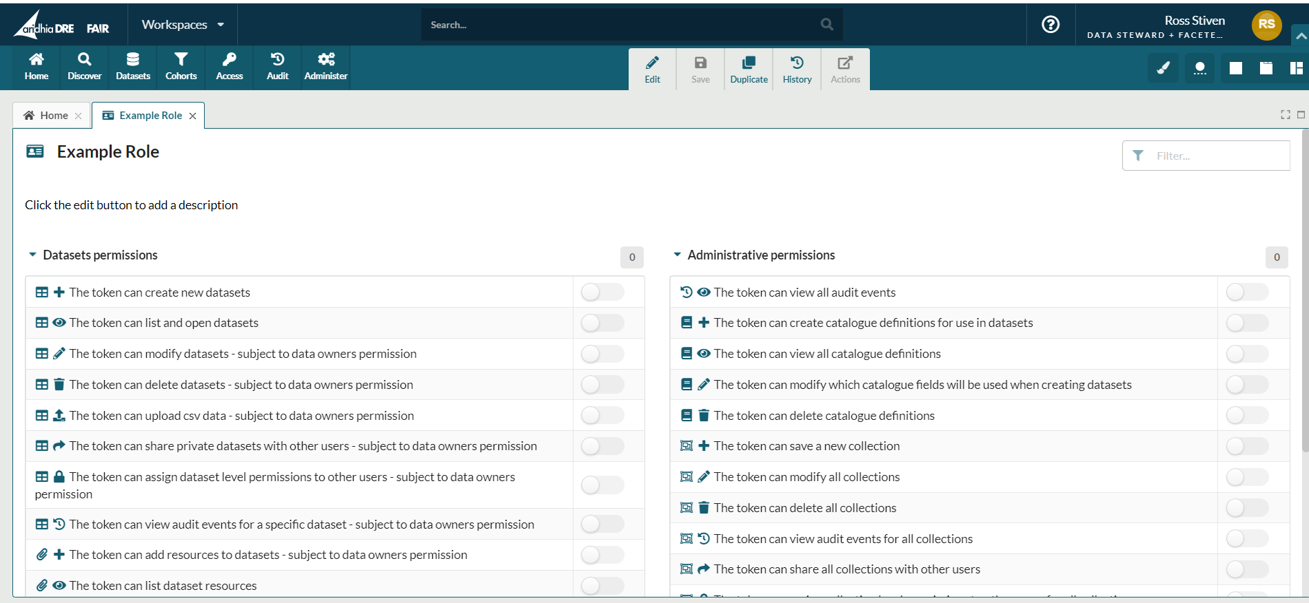 - Data Steward (API code: ‘data-steward’): can create, edit and delete datasets as well as assume the permissions of the Administrator role.