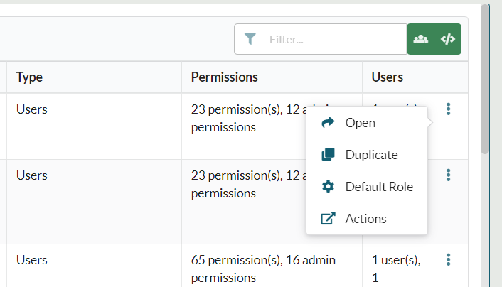 At the point of creation the custom role will have the permissions of the role it has been based on. These can be edited by navigating to the custom role in the Roles tab and selecting Open from this menu: