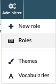 Roles can be created by selecting the 'New role' item in the 'Administer' dropdown or directly within the Roles panel above. A role creation dialog allows the following information to be specified:
