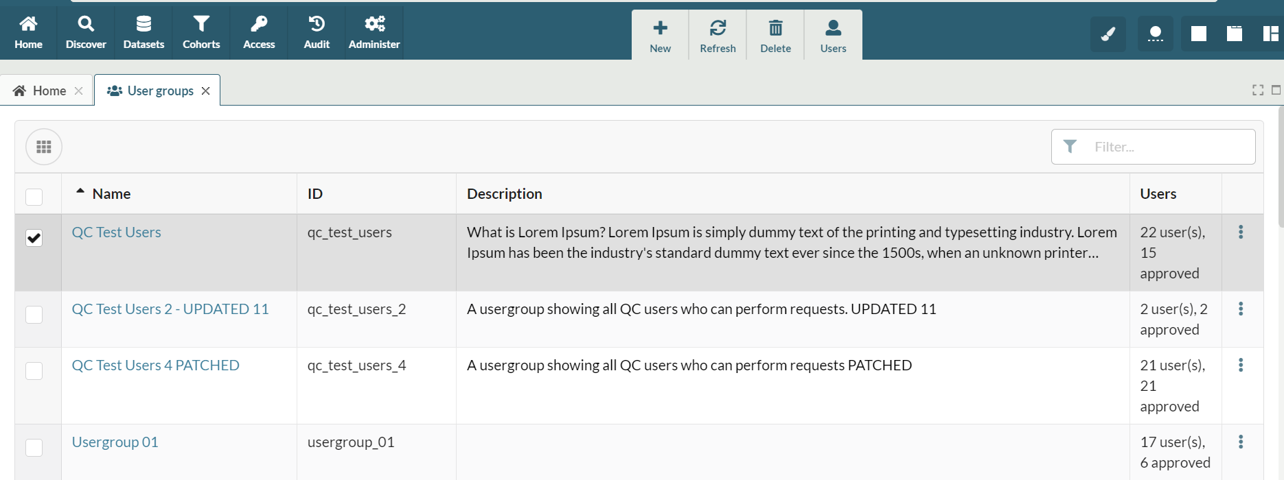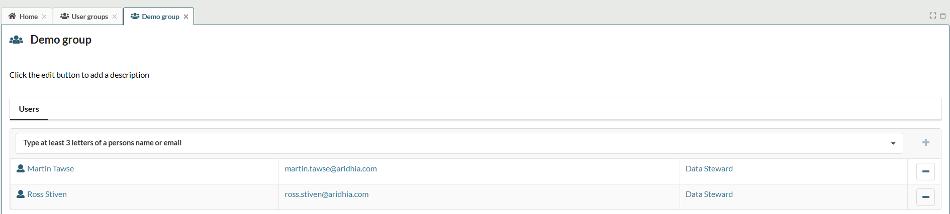 This opens the user group tab, which lists all current user groups in the FAIR instance:
