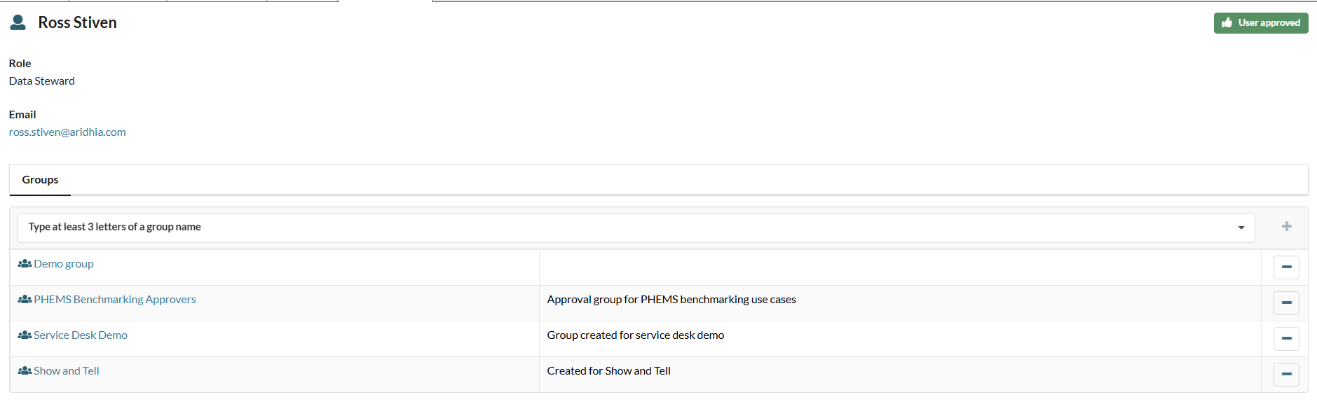 The users profile contains a list of all the groups the users is a member of. The search bar at the top of the list can be used to search for new groups to add the user to. Users can also be removed from groups on this page.