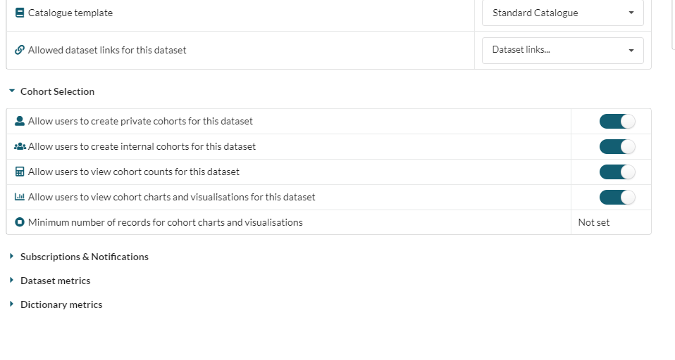 | Allow users to view cohort charts and visualisations for this dataset | Enables/disables the visualisation feature of the cohort UI |