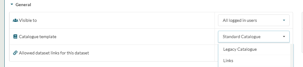 The data owner can change the catalogue template for their dataset via the Dataset Administration Tab. All enabled catalogue templates can be selected from the Catalogue template dropdown: