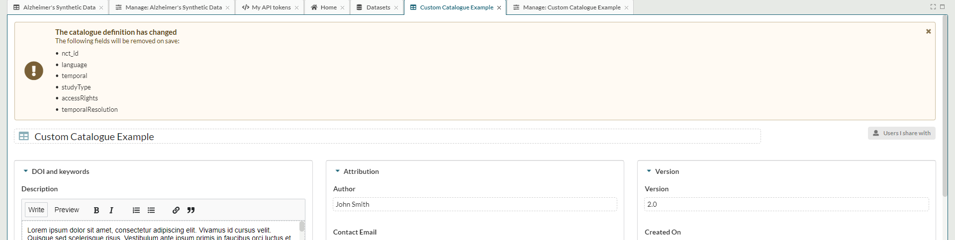 Similarly, if the new catalogue template contains required fields that do not exist in the previous template for the dataset, the data owner does not need to complete these until the first time they edit the dataset.