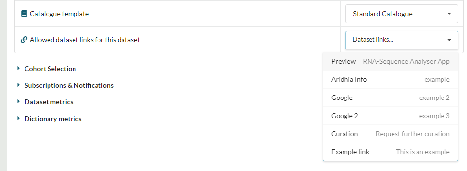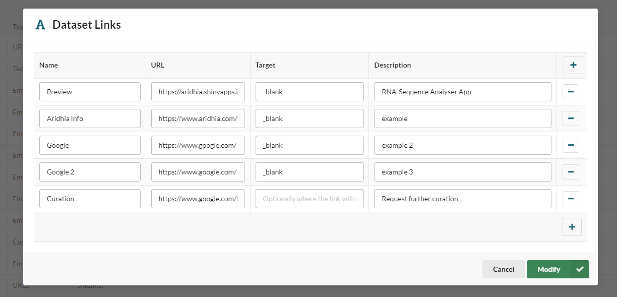 Data Owners can choose to add custom links to a dataset. There are two steps to this process:
