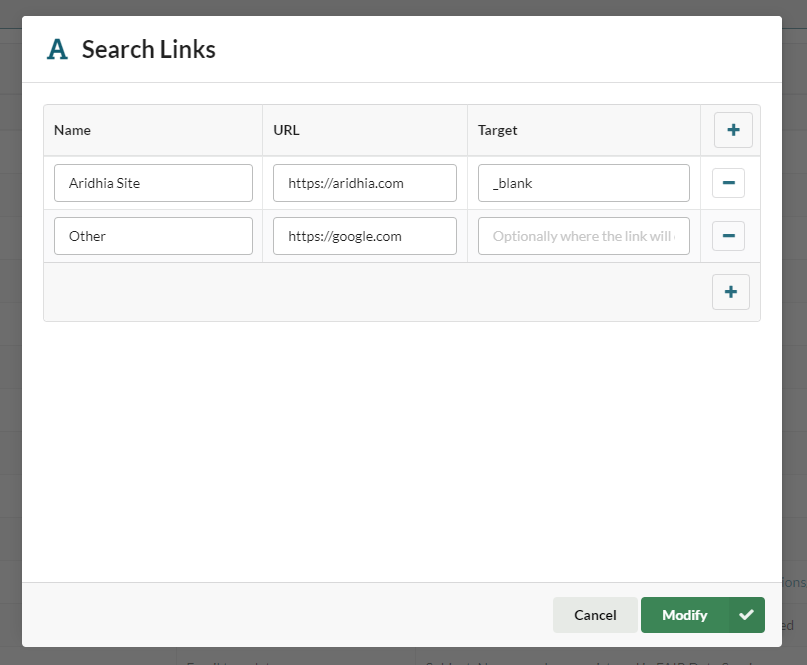 Users with administrative permissions can add custom links to Omni-Search results. This can be done using the Search Links Title and Search Links options in the Vocabularies tab.