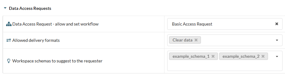 The data owner can add one or more recommended schemas here, these will be presented to any users requesting the dataset who will have the option of adding them to their DAR.