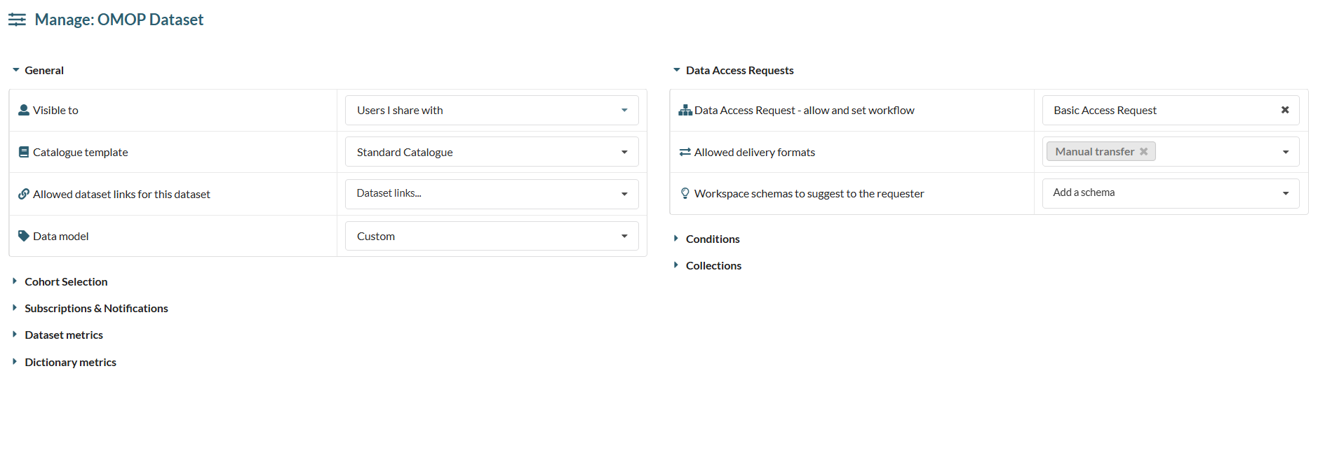 This section allows users to select a workflow for dataset approval, and set the allowed delivery formats for data transfers.