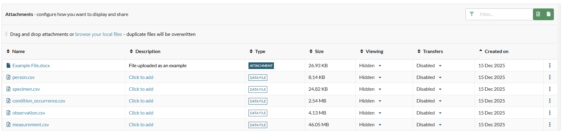 The attachments panel allows the data owner to manage the visibility and transferability of all attached files.