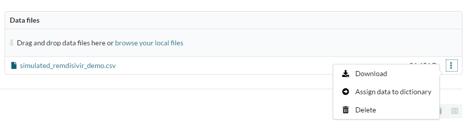 Data files can be download by either selecting the 'Download' option in the menu on the right-side of the file, or by clicking on the data file's filename. They can be deleted by selecting 'Delete' in the ellipsis adjacent to the file. You will be asked to enter the file name to confirm the deletion.