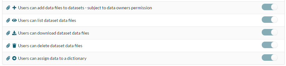 Data files have their own set of permissions that allow users to add, list, download and delete data files. There is also a separate set of permissions to allow users to assign data files to a dictionary, only then the CSV data fill will update or create a dictionary.