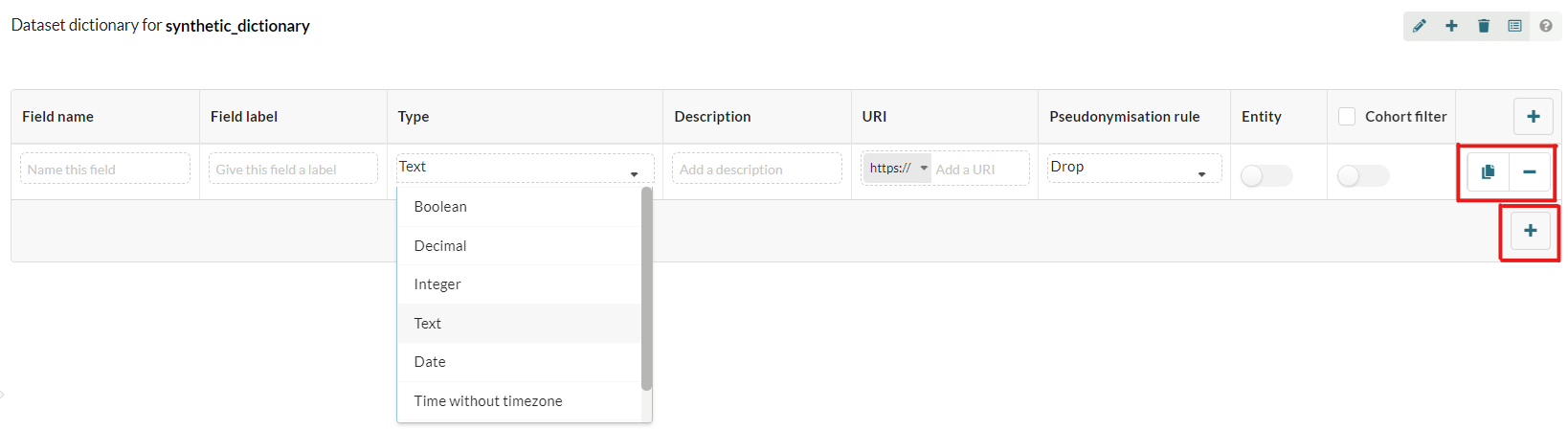 Additional fields can be added to the dictionary by selecting the ‘+' icon below the list of fields and fields can be removed by selecting the '-' icon adjacent to the field.