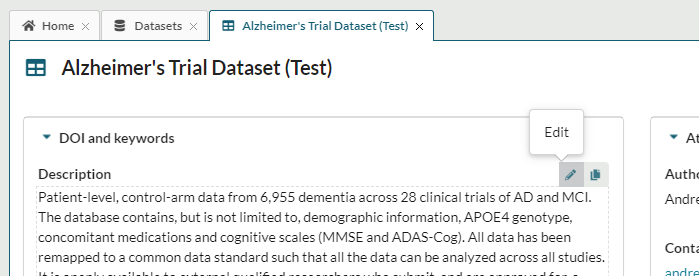 A dataset can be edited by navigating to the dataset and selecting the ‘Edit’ button in the actions ribbon. Editing or updating a dataset requires the Data Steward or Data Managers permissions (or via a custom role with appropriate permissions). Currently the data owner (i.e. the creator) of the dataset can only edit their own dataset. To edit a dataset while within the dataset page, click ‘Edit’ in the action ribbon menu.