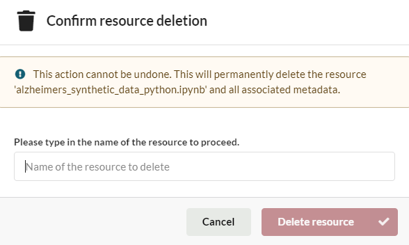 Resources can be deleted by selecting ‘Delete’ via the ellipsis adjacent to the attachment. The resource name must be entered to confirm the deletion.