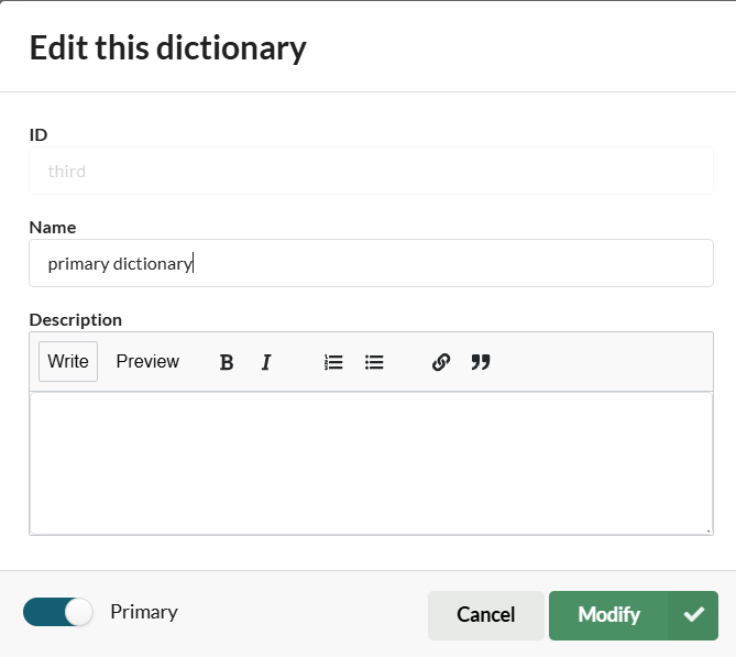 Data owners can assign a primary dictionary by selecting edit for the dictionary they wish to assign and toggling 'primary' on: