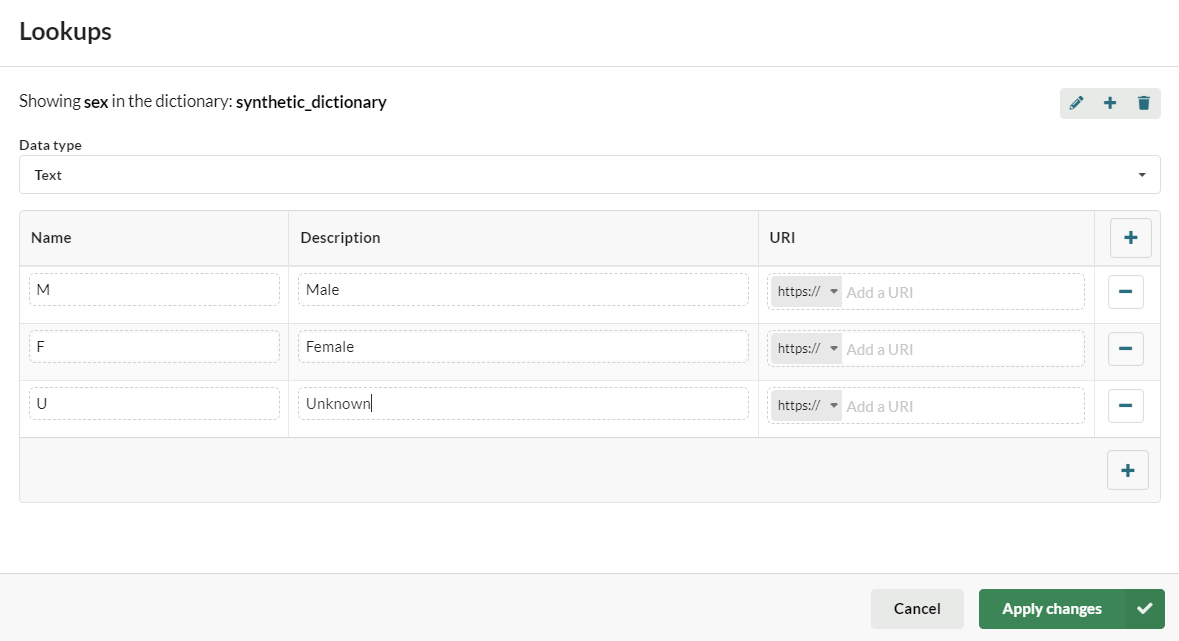 The controlled vocabulary can then be added to the dictionary by giving each lookup a ‘Name’ and ‘Description’. Rows by can added or removed by the ‘+' and '-’ icons respectively.