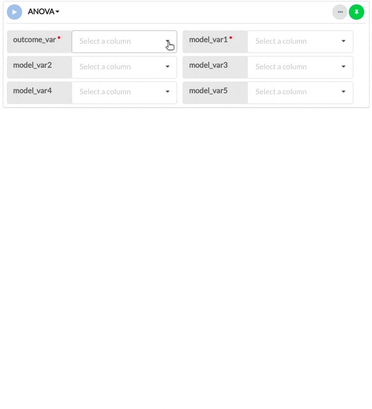 | model_var1 | Yes | Any column other than the column chosen for outcome_var. | The first independent variable or predictor variable to include in the modeled ANOVA. |