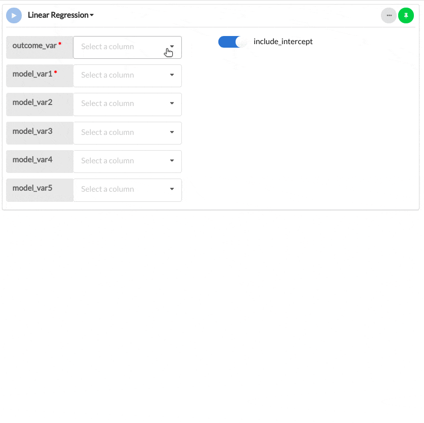 | model_var1 | Yes | Any column other than the column chosen for outcome_var. | The first independent variable or predictor variable to include in the linear model. |