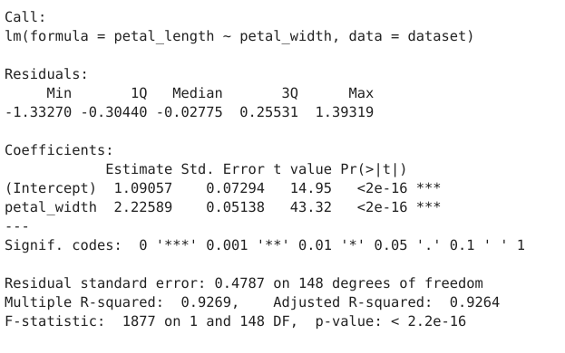 From the example output, we see that the linear model intercept is equal to 1.09, and the petal width coefficient is equal to 2.23, thus we can write our linear equation as follows:
