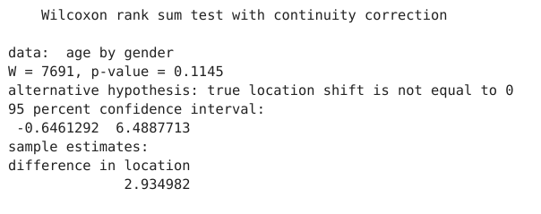 - Null hypothesis: the age distributions of males and females differ by a location shift of 0
