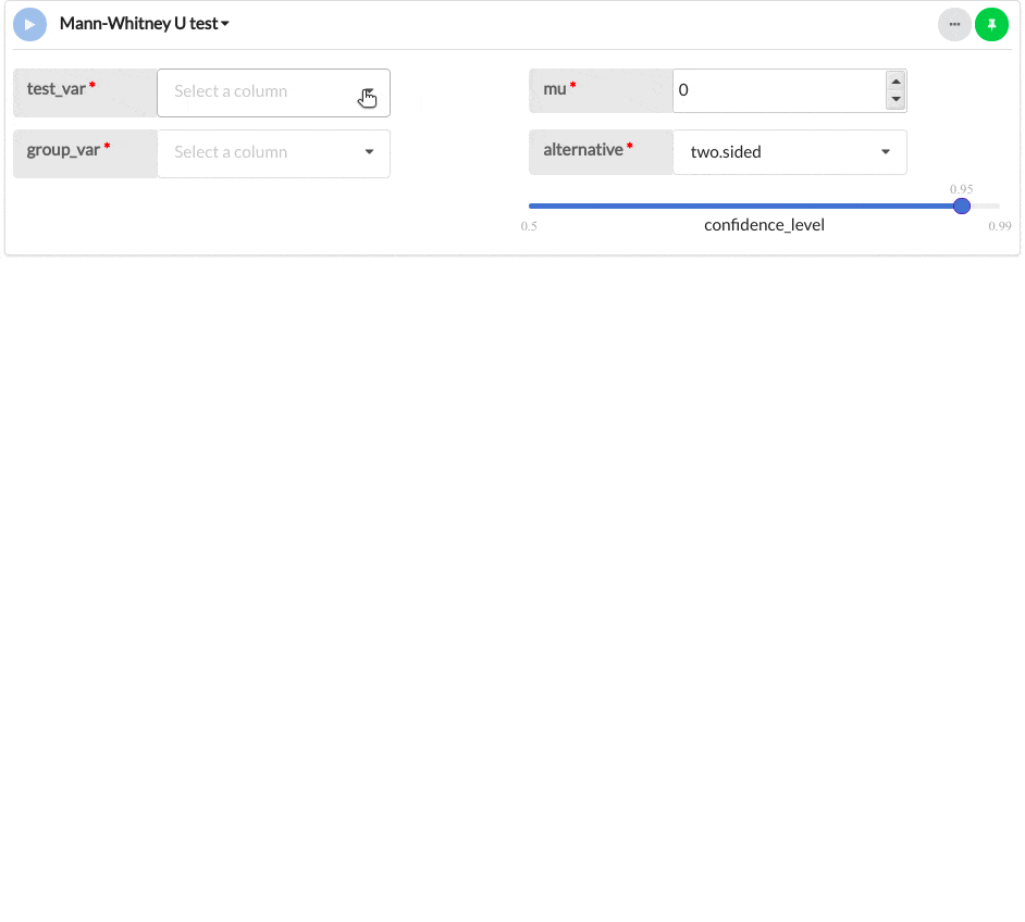 | group_var | Yes | Column Input. Text, Integer, Boolean, Date, DateTime | Categorical variable which provides the two independent samples. |