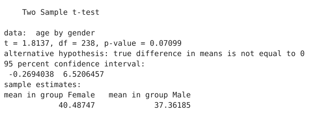 In the output, we see that the p-value is 0.07, which is greater than 0.05, thus we fail to reject the null hypothesis. We conclude that there there is no significant difference in mean age between males and females.