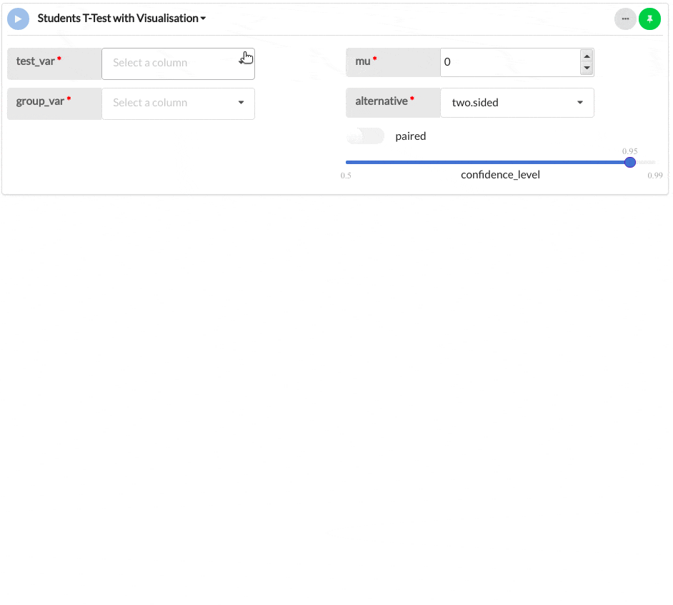 | alternative | Yes | Text selector. Default to two-sided. | Select from a greater, less or two-sided t-test. |
