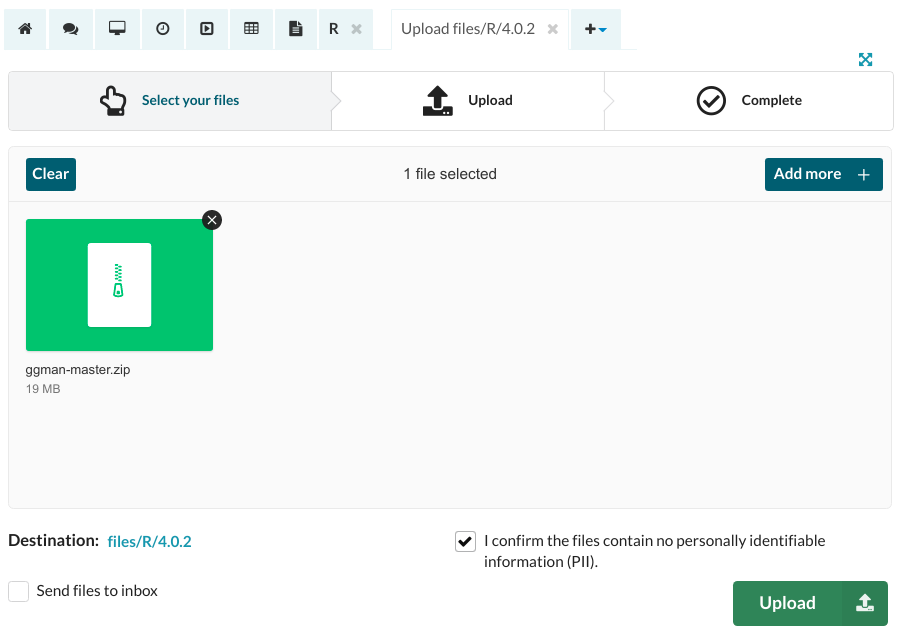 Then, upload the ZIP file to the workspace folder of the R version in which you intend to install the package. In this example, we upload the ZIP file to the ~/files/R/4.0.2/ directory.