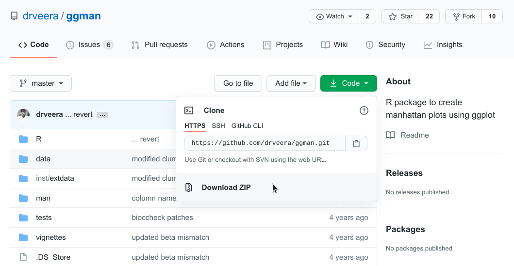 First, navigate to the ggman GitHub repository, and download the package as a ZIP file.