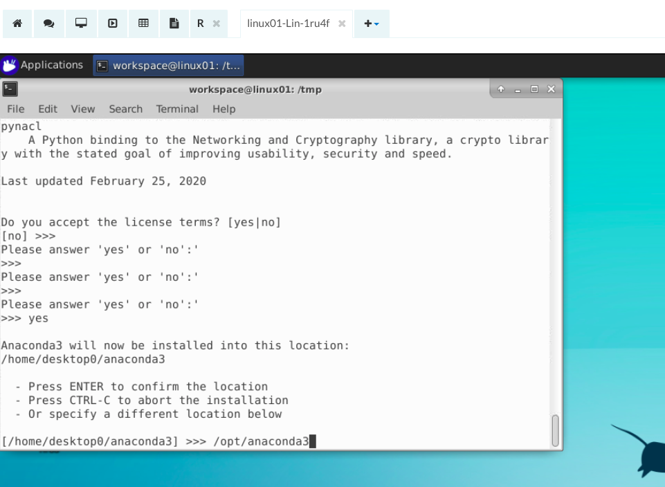 In your Virtual Machine, open the terminal, move into the tmp folder, and then use the copied link to download the latest Anaconda distribution: