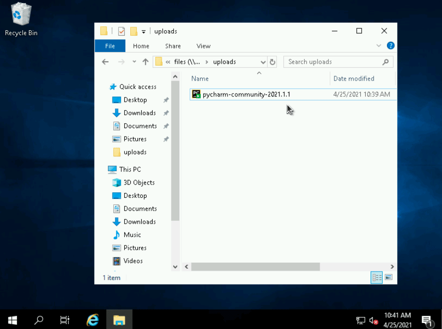 Connect to the Windows Virtual Machine and navigate to the uploads folder. Move the PyCharm installer to the desktop.