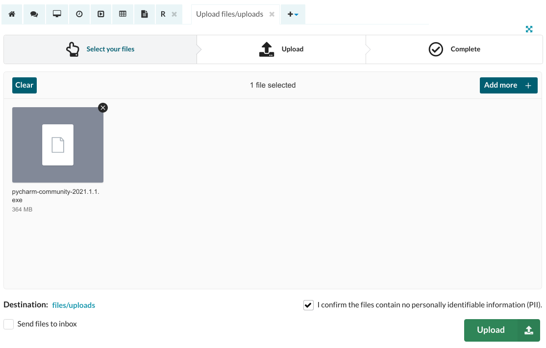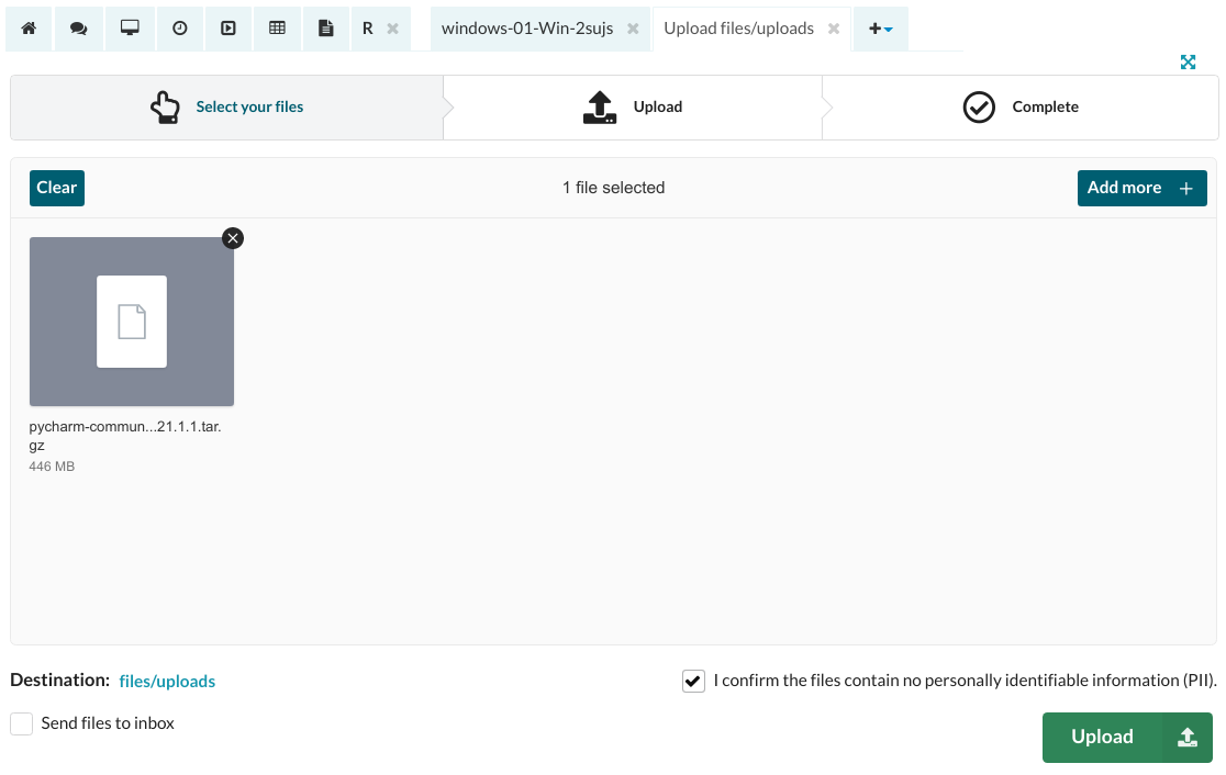 Then navigate to the Files tab and open your uploads folder. From here, press Add tab -> 'Upload File'. Upload your PyCharm installation file ( *.exe) here. More information about uploading files can be found on the Uploading files via the Workspace page.