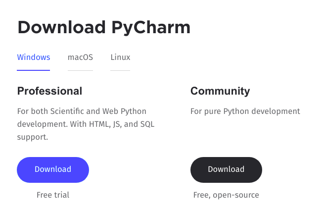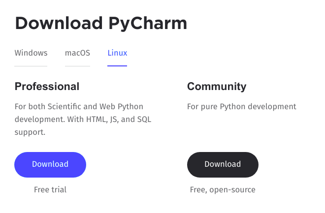Because Virtual Machine access to the Internet is restricted, you will need to do this step on your own computer. Navigate to the PyCharm distributions page and download the latest Community version.