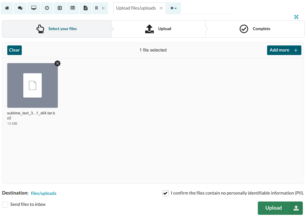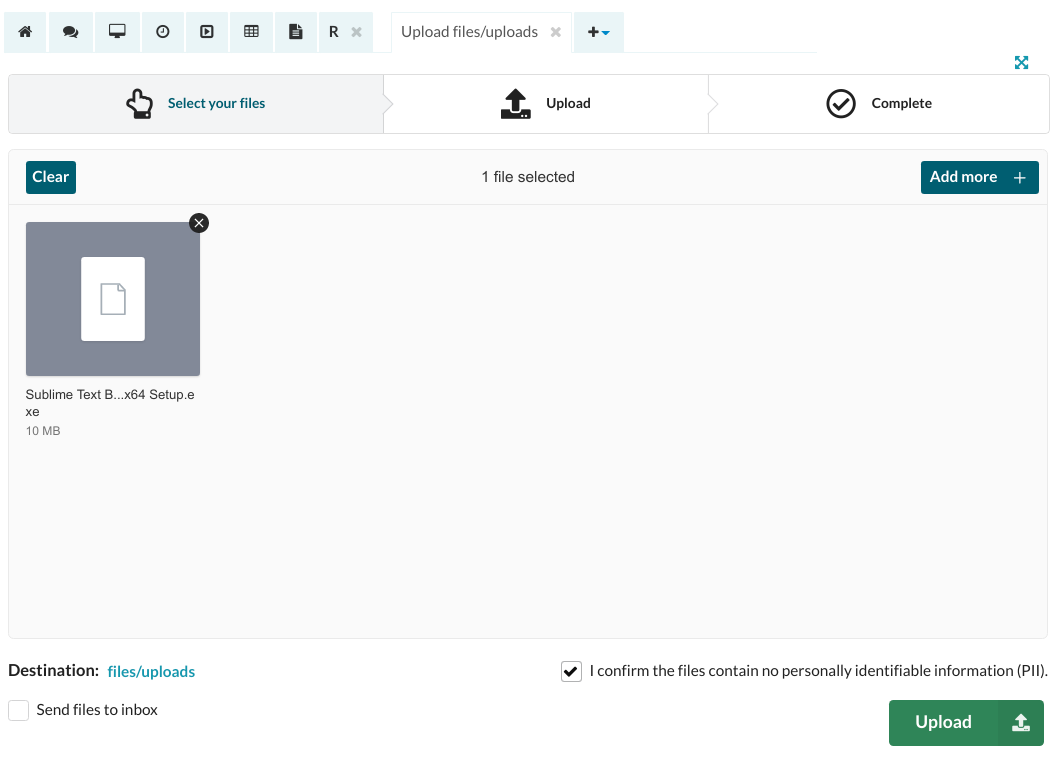 Then navigate to the Files tab and open your uploads folder. From here, press Add tab -> 'Upload File'. Upload your Sublime Text installation file (*.exe) here. More information about uploading files can be found on the Uploading files via the Workspace page.