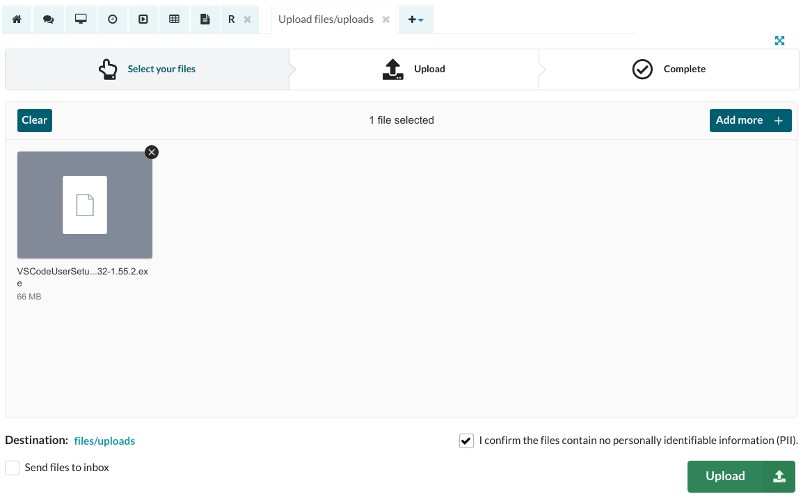 Then navigate to the Files tab and open your uploads folder. From here, press Add tab -> 'Upload File'. Upload your VSCode installation file ( *.exe) here. More information about uploading files can be found on the Uploading files via the Workspace page.