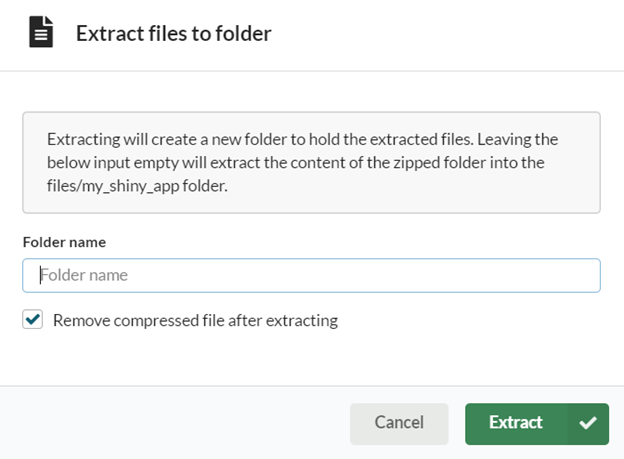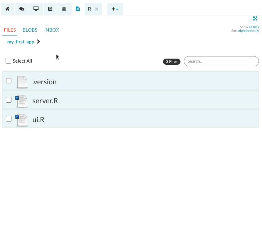 This will create a new folder in the Files tab with the same name as the new Web App. Look for this folder (which we from now on will refer to as “the Web App folder”) and delete the app.R file in it. Make sure you keep the .version file!