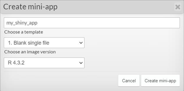 To upload your own Web App to a workspace, first, create a new Web App using the App dropdown menu. Then, you will be asked to name the Web App and choose a blank template. The template you choose will depend on whether you are using multiple files (server.R + ui.R) or a single file (app.R) in your application.