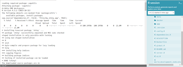 Once you created a blank template, navigate to the Web App folder in the Files tab, and paste your code into the appropriate files. Note that any libraries that the Web App uses will need to be installed in the workspace R Console.