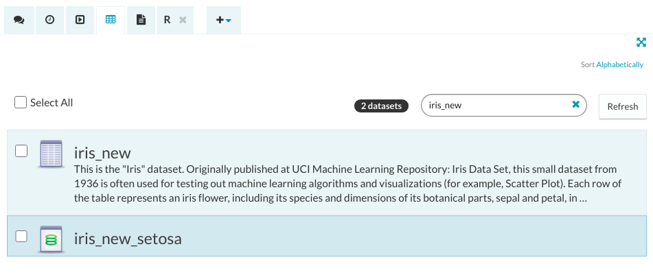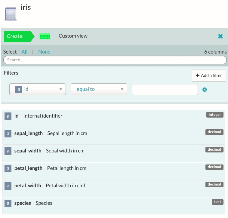 Once you are finished editing, click the ‘Create custom view’ button and provide a name e.g ‘iris_new_septosa’. A newly created custom view of the dataset will appear with a green icon in the Datasets tab.
