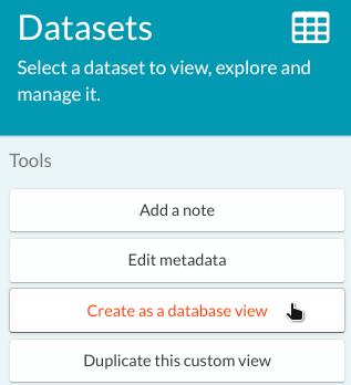 To create a database view, highlight the custom view in the Datasets tab then click the ‘Create as a database view’ button.