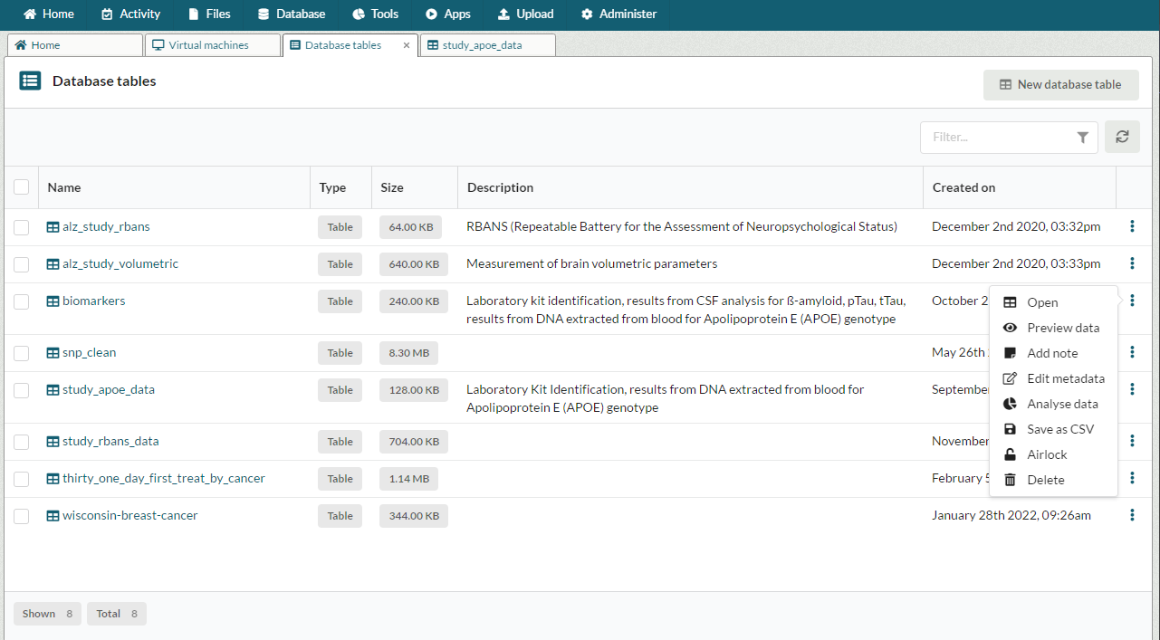 Once the database table you want to work with is visible, you can view available options and the information about the table. To view options, click the menu icon on the right of the table row.