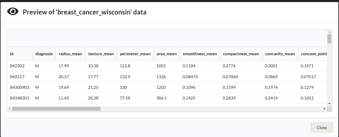 You can easily preview the contents of a data table by clicking the ‘Preview data’ button in the menu of the data table. This will open up a new dialog showing a sample of rows from the dataset.