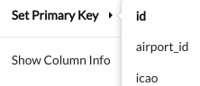 To change the table's primary key, click on the cog icon at the top left of the table and select 'Set Primary Key'. Columns that meet the criteria for a primary key (no duplicate values in the first 10 GB), will be displayed. Click on the column that you want to use as the new primary key of the table.
