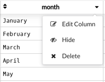 To delete a column, select the dropdown arrow at the end of a column and click ‘Delete’ to delete it from the table. If this is done in error, it can be reversed by clicking the ‘Undo’ button. The ability to delete columns is not available in sample mode.