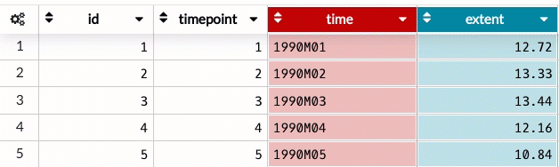 To sort your data by one or more columns, click the up and down arrow icon on the left of the column name. Clicking once will sort the data in ascending order, twice - in descending order. Clicking three times will clear the sort. The example below shows data sorted by the extent and then by time.