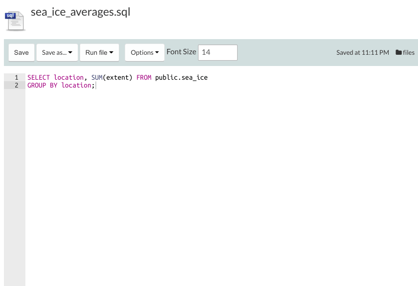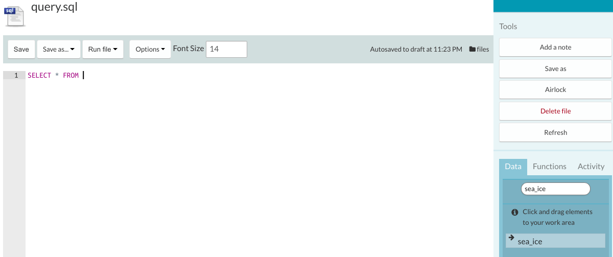 Opening or creating a new SQL file directs you to the SQL Editor page. The editor allows you to import data tables, use built-in functions and run real-time queries on the data.