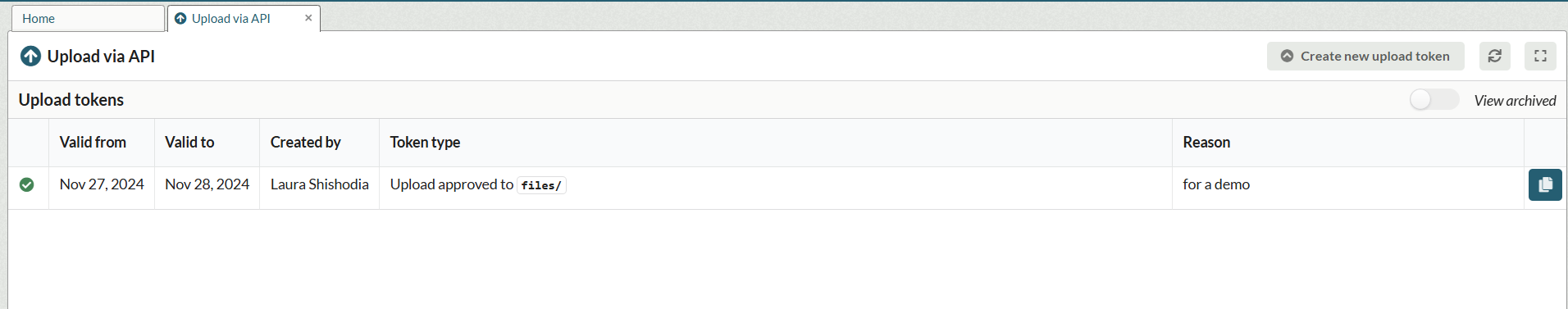 To view current or expired upload tokens, use the Manage upload tokens option in the Upload menu.