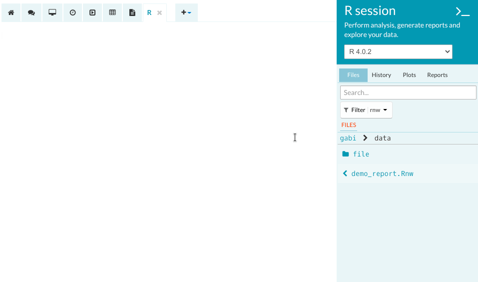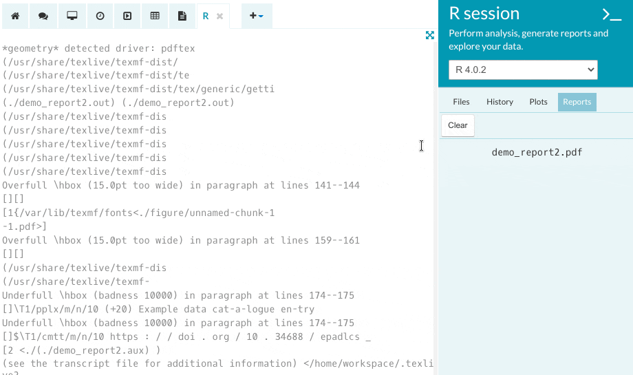 Alternatively, if you are just starting out with dynamic report generation, you can use this demo report script provided by Aridhia as a starting point. You will need to unzip it and upload the *.rnw file to your workspace. Then you can follow the remaining steps to learn how to generate PDF reports in the workspace.